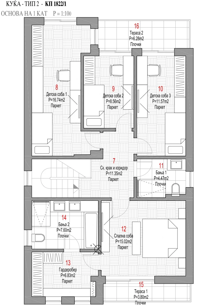 Овој прекрасен модел на куќа се простира на 173 м² со четири спални соби и гаража, беспрекорно комбинирајќи модерен дизајн со функционалност. По влегувањето, фоајето ве пречекува со пространи гардеробери и пријатна клупа, која се поврзува со гаражата. Дневната површина со отворен план има експанзивно застаклување на терасата, беспрекорно интегрирање на внатрешните и надворешните простори. Зоната за летна релаксација го проширува просторот за одмор, додека соседната трпезарија се поврзува со светлечка кујна со практичен распоред во форма на буквата У.