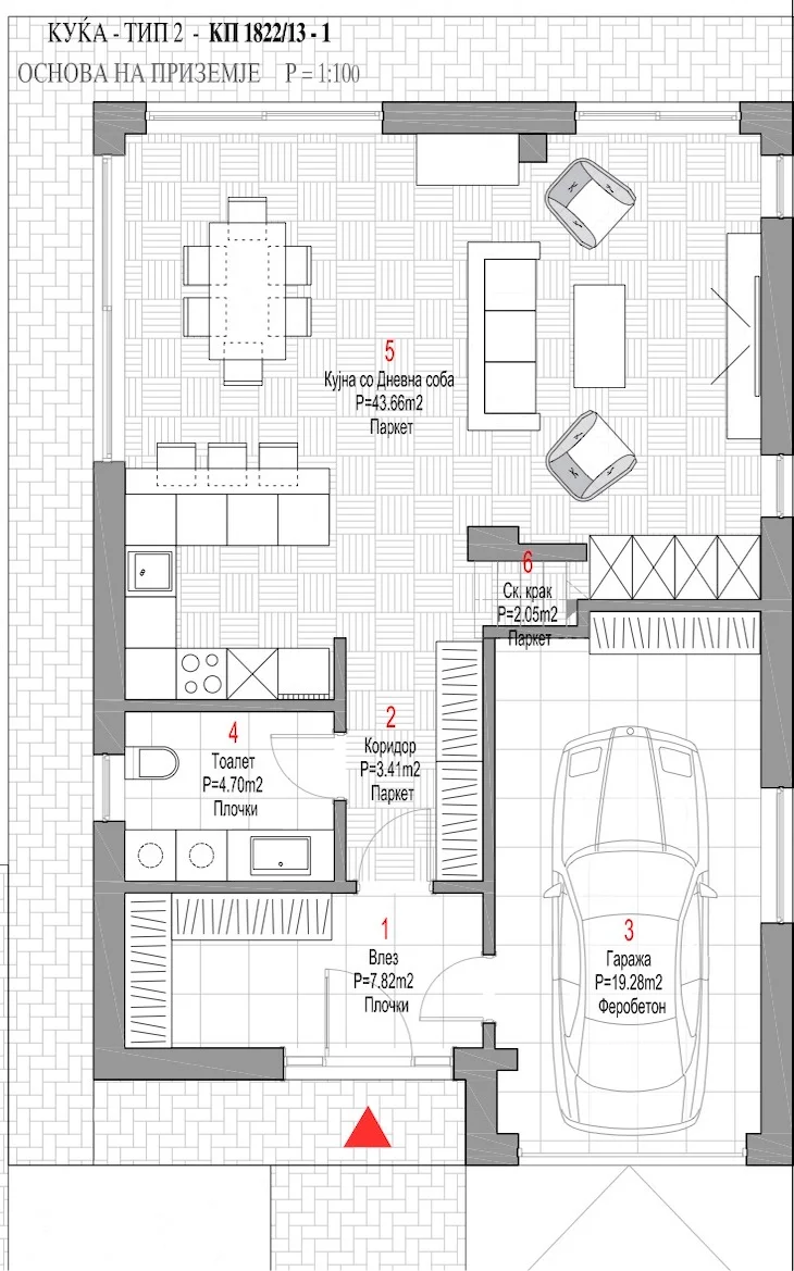 Овој прекрасен модел на куќа се простира на 173 м² со четири спални соби и гаража, беспрекорно комбинирајќи модерен дизајн со функционалност. По влегувањето, фоајето ве пречекува со пространи гардеробери и пријатна клупа, која се поврзува со гаражата. Дневната површина со отворен план има експанзивно застаклување на терасата, беспрекорно интегрирање на внатрешните и надворешните простори. Зоната за летна релаксација го проширува просторот за одмор, додека соседната трпезарија се поврзува со светлечка кујна со практичен распоред во форма на буквата У.