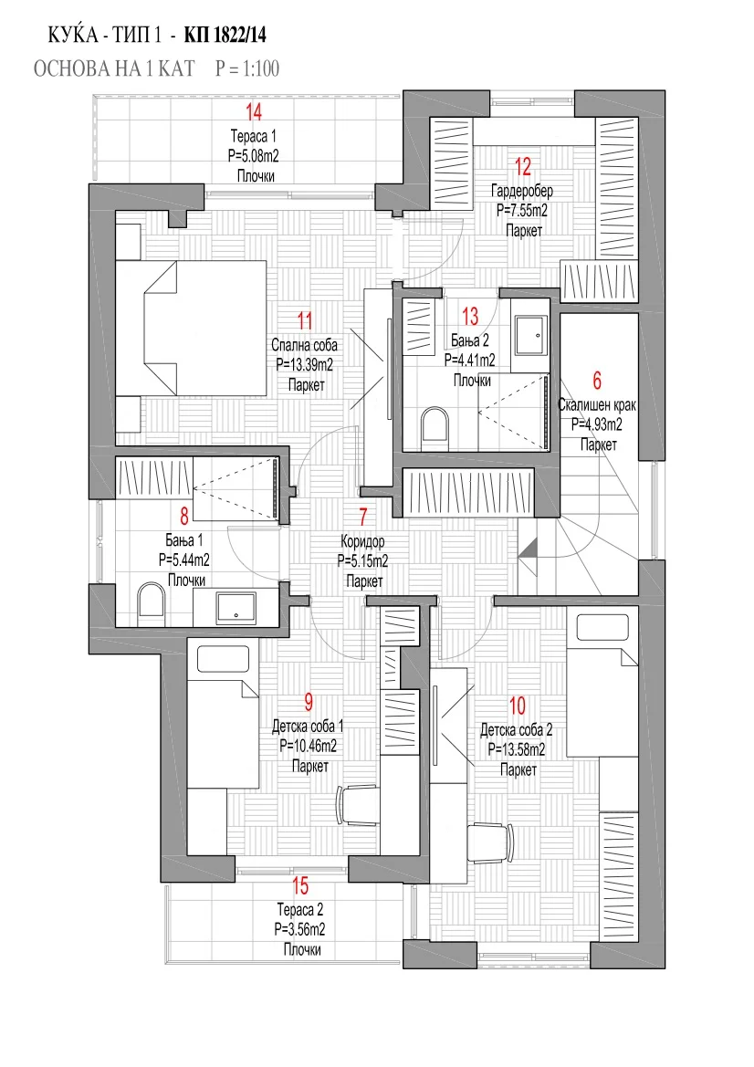 Главниот влез, сместен под покривот на предниот балкон, се отвора во влезниот хол со простор за гардеробер и седење. Дневната површина, облеана во сончева светлина, се протега до тераса идеална за релаксација на отворено. Во непосредна близина на овој простор, трпезаријата се поврзува со практична кујна со полуостров и прозорец кој ја преплавува просторијата со светлина. Двата дела од куќата нудат лесен пристап до бањата и котларата од ходникот. Приземјето вклучува и импресивен камин за дополнителна топлина и амбиент.